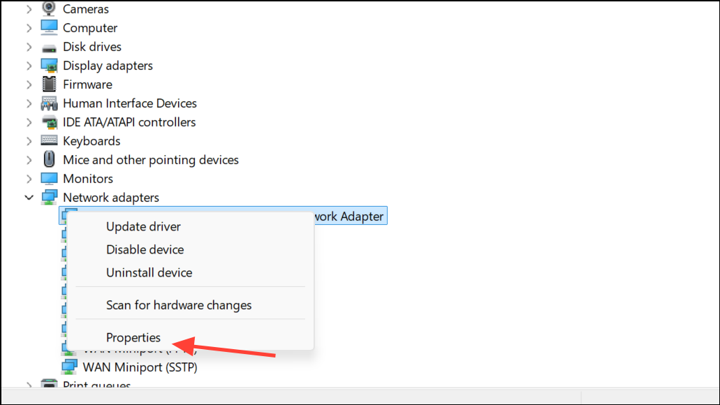 Крок 1:У менеджері пристроїв клацніть правою кнопкою миші мережевий адаптер та виберітьВластивості.