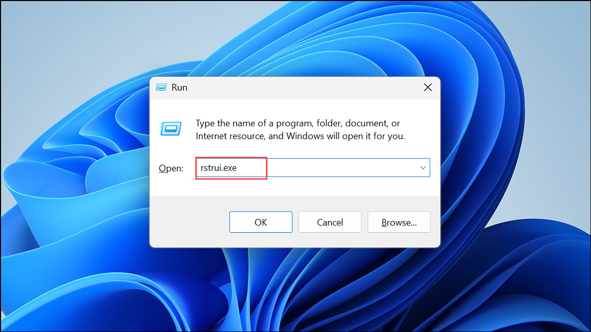 Крок 1:ПресуватиWindows + R, типrstrui.exe, і натиснітьУвійти. Дотримуйтесь підказок відновити вашу систему до певного моменту до початку проблеми синього екрану. Це повертає системні файли та драйвери до попереднього, стабільного стану.