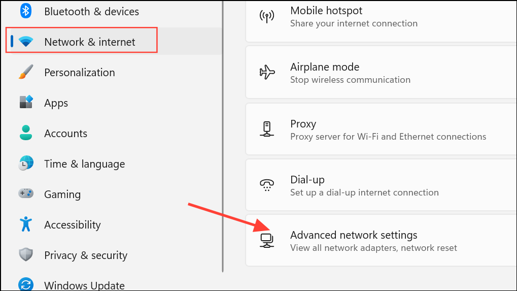 Крок 1:ВІДЧИНЕНОНалаштуванняі йти доМережа та Інтернет. Прокрутіть вниз і виберітьРозширені налаштування мережі.