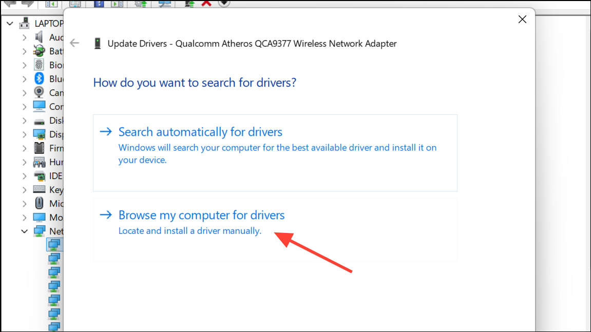 Крок 2:У безпечному режимі, відкритих диспетчер пристроїв, видаліть проблемний мережевий адаптер та встановіть правильний драйвер вручну, клацнувши правою кнопкою миші адаптера та вибравшиОновлення драйвера> Перегляньте мій комп'ютер для драйверів. Вкажіть на папку, що містить завантажені файли драйверів.